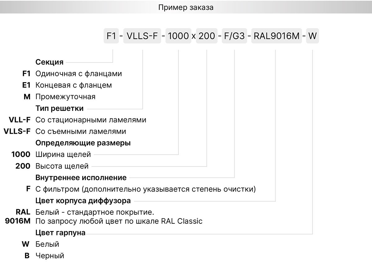 Используемые материалы. Щелевые решетки VLL-F и VLLS-F изготавливаются из экструдированного алюминиевого профиля АД31 по ГОСТ 22233-2018. По умолчанию корпус решетки окрашивается в стандартный белый цвет RAL 9016М матовый, а внутреннее исполнение в чёрный цвет RAL9005М матовый. По индивидуальному заказу возможна окраска в любой цвет по шкале RAL. Статическая камера изготавливается из оцинкованной листовой стали 0,4 - 1,5 мм в зависимости от размера и пожелания заказчика. По умолчанию все изделия поставляются в неокрашенном виде.