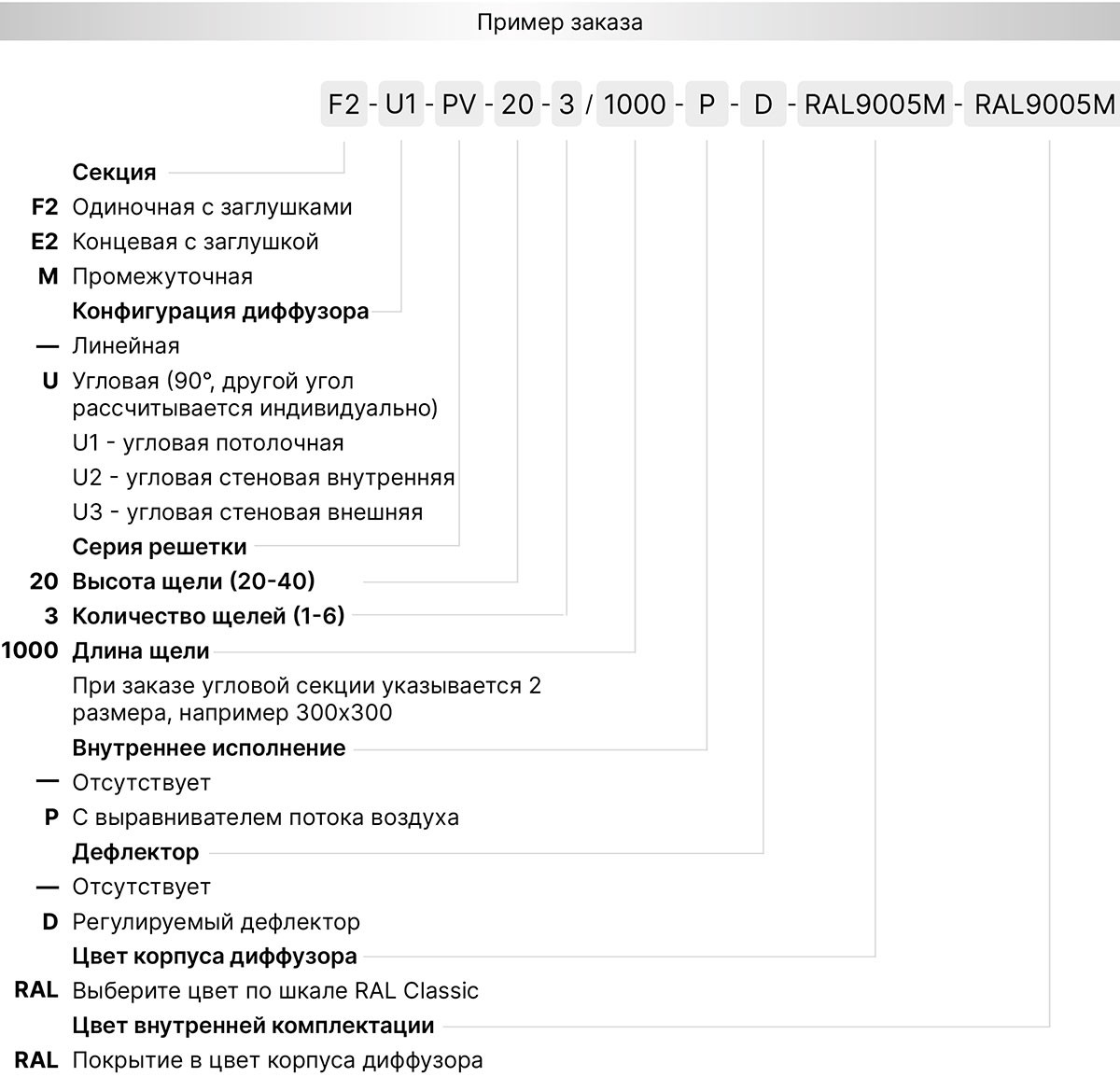 По индивидуальному заказу возможно изготовление радиусных и угловых диффузоров для создания сложных геометрических форм. Также доступны различные варианты направления воздушного потока (вертикальные и наклонные струи под углом 30-60°).
